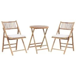 Met deze prachtige balkon set breng je een natuurlijk gevoel naar je balkon of terras. Zowel de tafel als de stoelen zijn gemaakt van bamboe, een natuurlijk en duurzaam materiaal. De set heeft kussens met dikke vulling voor een hoog zitcomfort. Daar