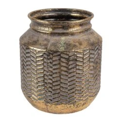 Decoratieve mooie, ronde, goudkleurige, metalen bloempot, in een retro stijl, van het merk Clayre & Eef. Opening bovenzijde bloempot Ø 18 cm. Deze bloempot is niet waterdicht.